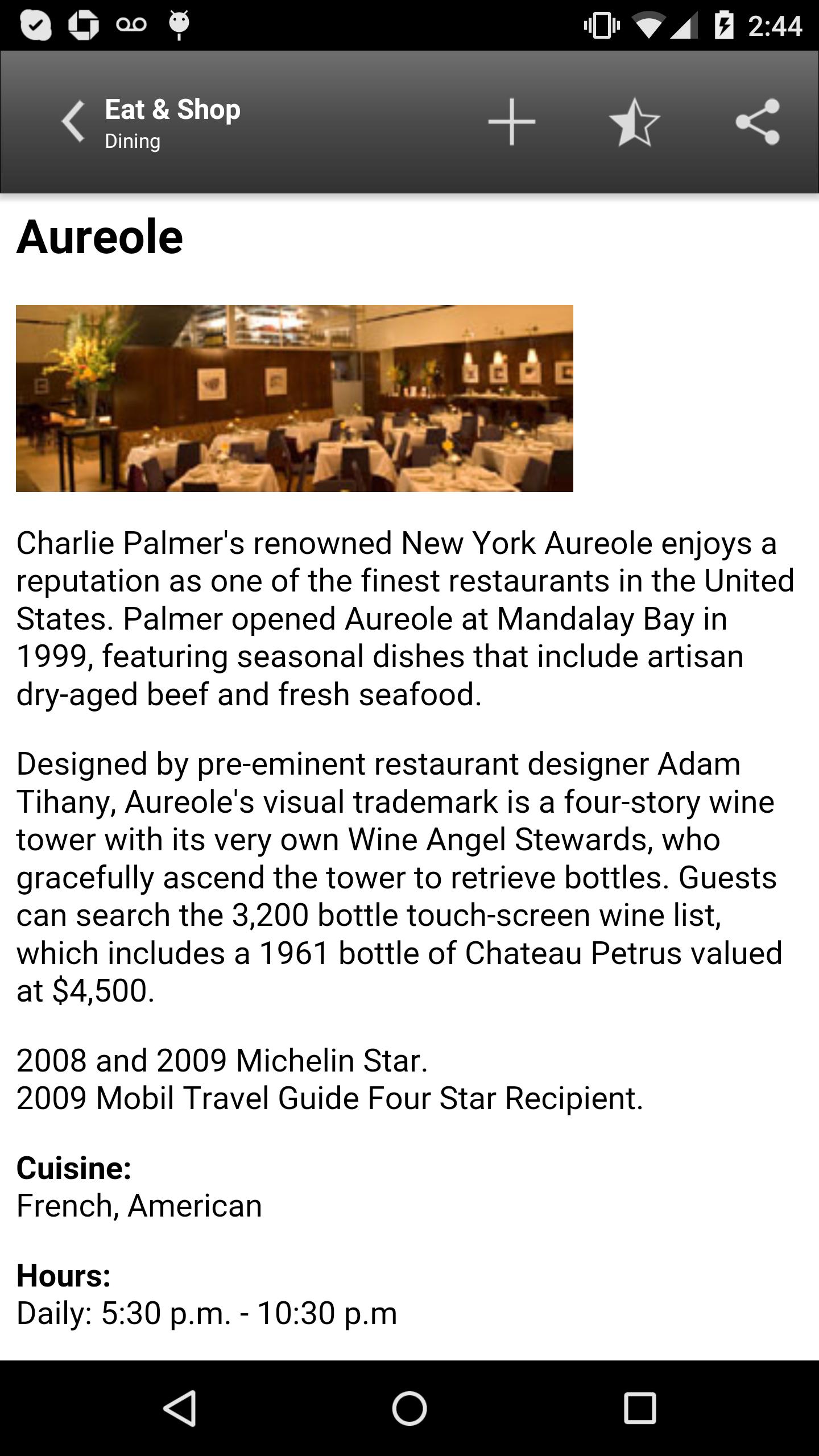 Cette application de conciergerie interactive propose des nouvelles, des menus, des directions, des billets, de la météo, des offres spéciales, des conseils, des vidéos et plus encore. Avec plus de 300 entrées de contenu dynamique et plus de 500 photos (et en croissance), c'est un excellent moyen d'améliorer votre visite et d'explorer Mandalay Bay en déplacement.