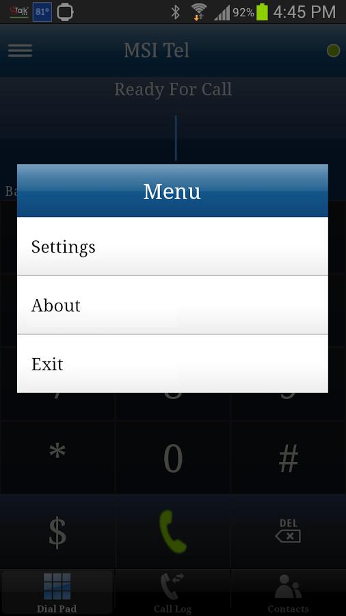 " MSI Tel " peut être utilisé sur les ensembles de téléphones Android compatibles pour effectuer des appels VoIP à l'aide d'un fournisseur de services. Il permet des appels vocaux internationaux sur le réseau WiFi ou 3G / 4G. Le fournisseur de services qui a regroupé cette application avec leurs services peut offrir à leurs clients de télécharger MSI Tel Dialer. Après l'installation, l'utilisateur a besoin de nom d'utilisateur et de mot de passe. Veuillez contacter votre revendeur pour obtenir une broche d'accès.