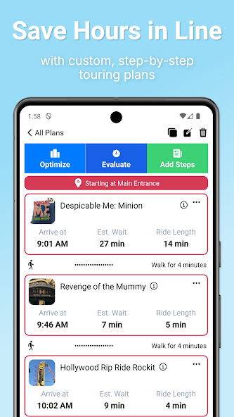 -Les plans de tourisme étape par étape personnalisés pour les studios universels en Floride et les îles des parcs d'aventure, y compris le monde sorcier des régions de Harry Potter de chaque parc. Vous indiquez que les promenades que vous souhaitez voir et les lignes créeront un itinéraire étape par étape montrant quand aller à chaque conduite pour éviter les longues lignes. Vous pouvez même changer vos plans pendant que vous êtes dans le parc!