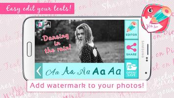 L'édition et l'écriture d'images sur des images n'ont jamais été aussi simples! Avec Write Text on Pictures vous pouvez expérimenter avec une grande variété de polices mignonnes, ou ajouter des frontières, des ombres, remplir, ajuster l'opacité et ajouter gratuitement la date et les horodatages! Si vous avez déjà fait votre image de collage préférée, appliqué des effets de photo et des filtres et ajouté des cadres d'image, la prochaine chose à faire est de télécharger cette application Picsay et d'ajouter une étincelle de votre touche personnelle à vos photos de Cymera! Enrichissez vos photos de luxe avec des citations et des messages sympas et amusez-vous à utiliser cette jolie application de photomaton. Améliorez des photos de couple d'amour et des images drôles en utilisant ce éditeur de photos 2014 Pro! Les applications photo de filigrane et les éditeurs de texte sont la nouvelle mode Photolab - obtenez le vôtre aujourd'hui!
