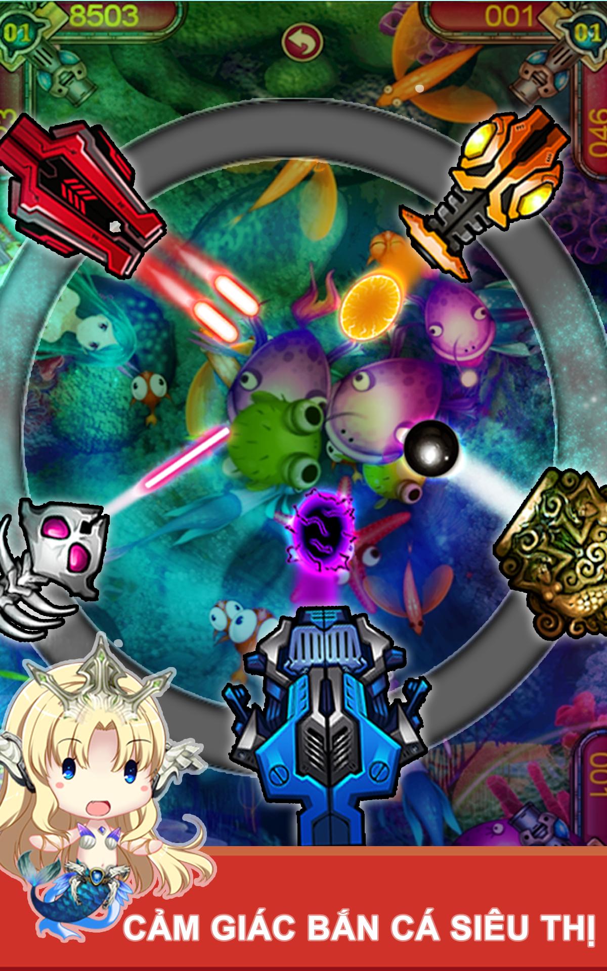 - " Ban Ca Online 4 Nguoi " a une gamme complète d'armes à feu comme Shoot Supermarket Fish avec 6 sponsors utilisés pour tirer sur des poissons qui vous attendent à explorer.