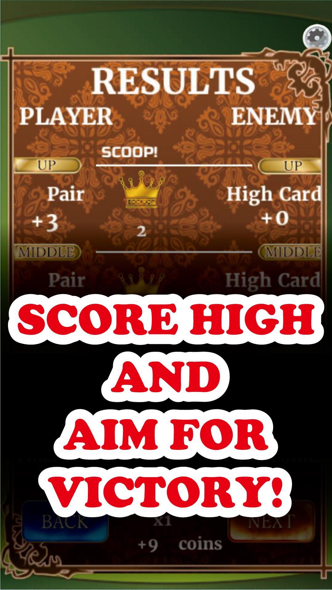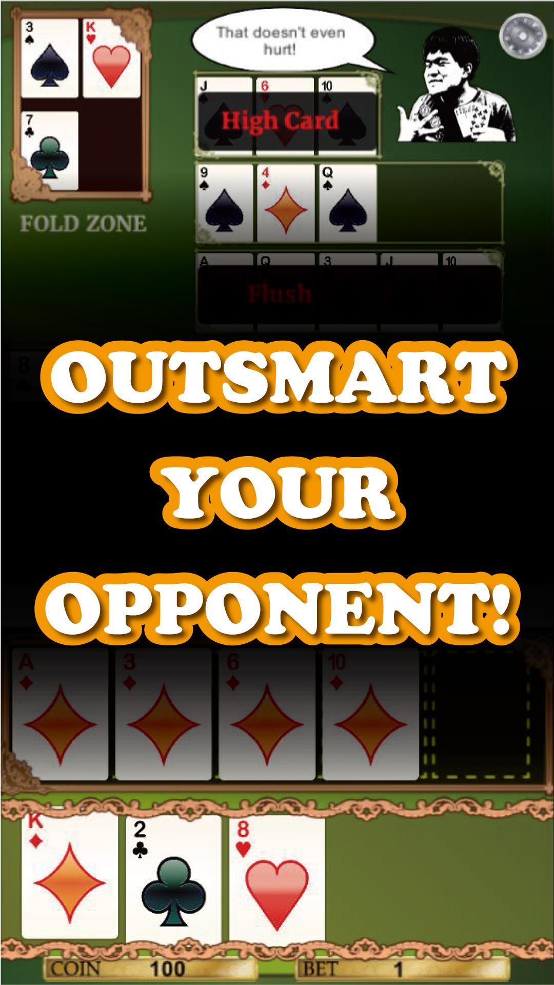 Dans ce type de poker, vous créez des combinaisons de mains de poker pour battre votre adversaire tout en étant en mesure de voir ce qu'il fait à tour à son tour, un style de visage ouvert. De plus, jouez avec des règles d'ananas, qui vous permettent de choisir vos cartes parmi celles données et de jeter celles que vous ne souhaitez pas utiliser. AVERTISSEMENT: Des compétences de stratégie et de réflexion sont nécessaires!