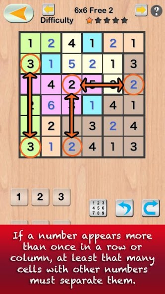 Si deux nombres identiques apparaissent dans la même ligne ou la même colonne, au moins que de nombreuses cellules avec d'autres nombres doivent les séparer. Par exemple, deux cellules contenant «1» peuvent ne pas être adjacentes à l'orthogon, mais doivent avoir au moins une cellule entre elles avec un nombre différent. Deux cellules marquées «3» dans la même ligne ou la même colonne doivent avoir au moins trois cellules avec d'autres nombres entre eux dans cette ligne ou cette colonne, etc.