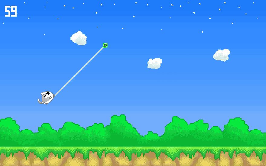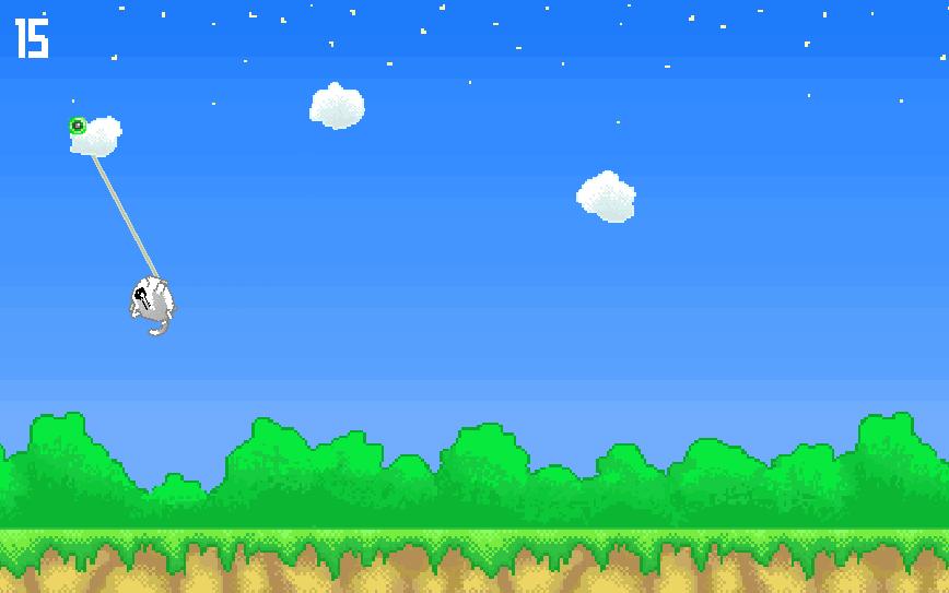 Action Pixel Game où Cat utilise le yo-yo pour s'accrocher sur les nuages et sauter en avant.