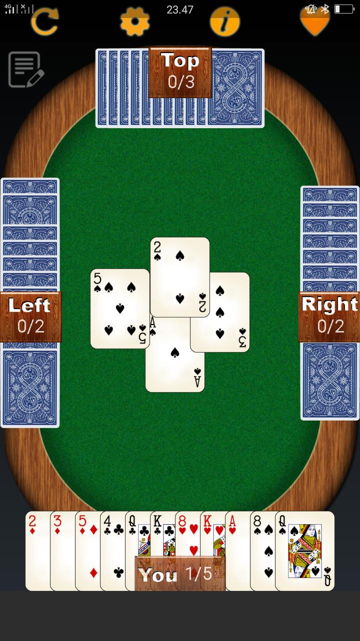 permanent trumps: any card of the Spade suit beats any card of any other suit. Deal and play are counter-clockwise.