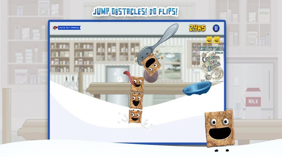 The object of the game is to have a smooth run and have fun (while licking and chomping Cinnamon Toast Crunch along the way). Power Ups will help move you faster. Any bumps, stumbles, licks or spills will slow you down. Just don’t let them slow you enough to get eaten!
