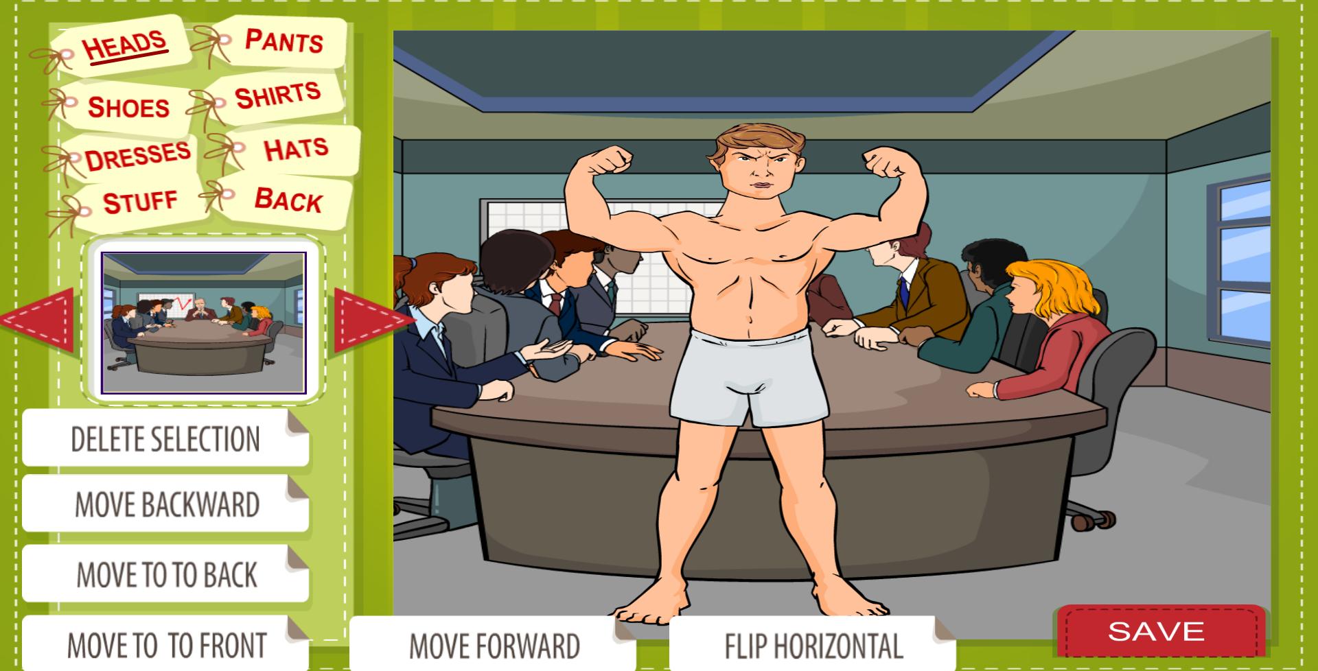 Dress the dork by selecting items and then clicking and dragging them into the body. You can resize items with finger by dragging over the corners of the item when it is selected. Use buttons to change items depth.