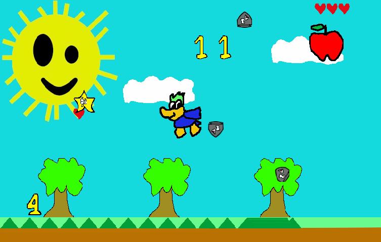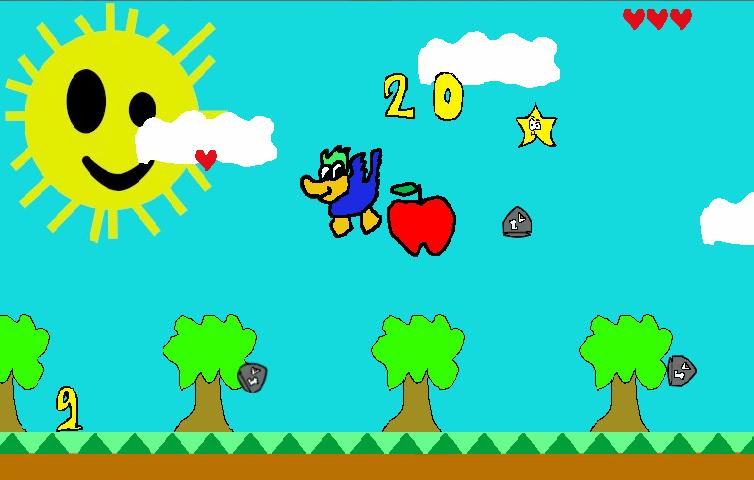 Move Peter the flying duck with your finger (tap or keep touching screen and moving), avoid the small projectiles ( bullets ), and caught stars, hearts and apples