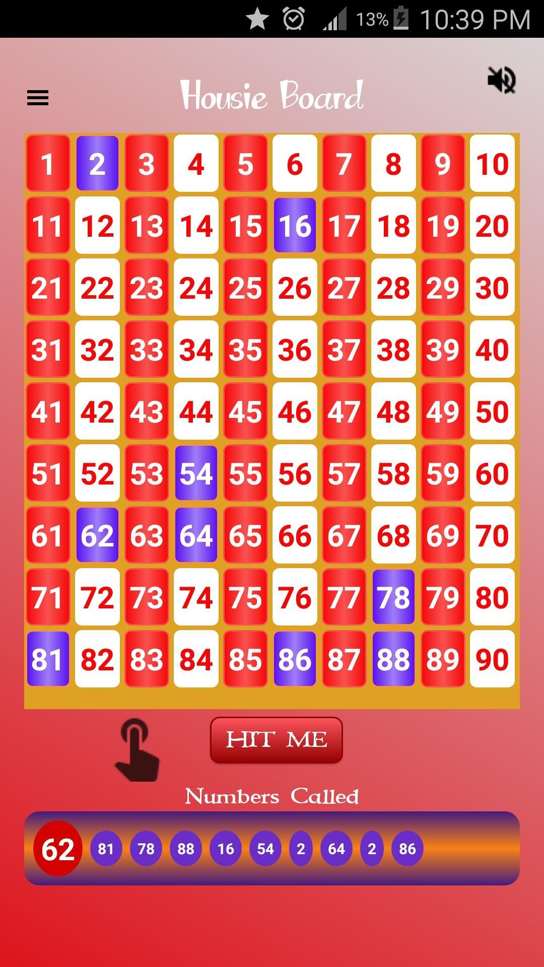 Caller calls a number by clicking "Hit Me" button and the number automatically gets highligted on the Housie board. Players click the called number on their respective Housie tickets.