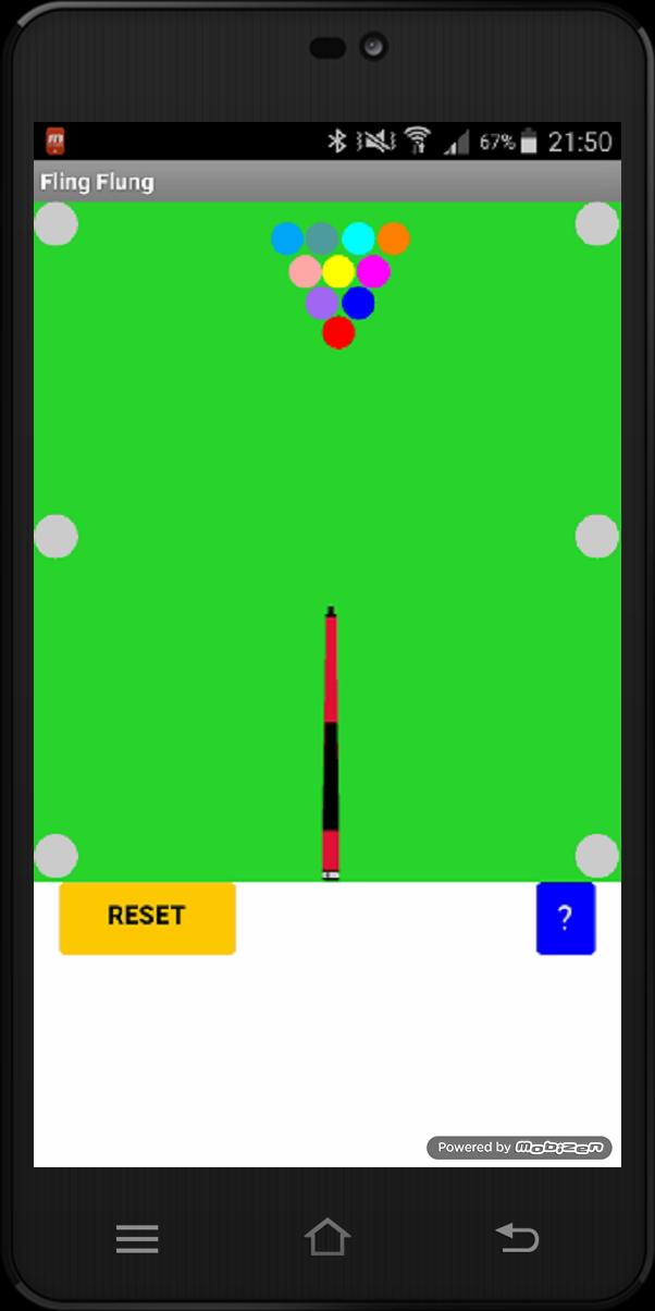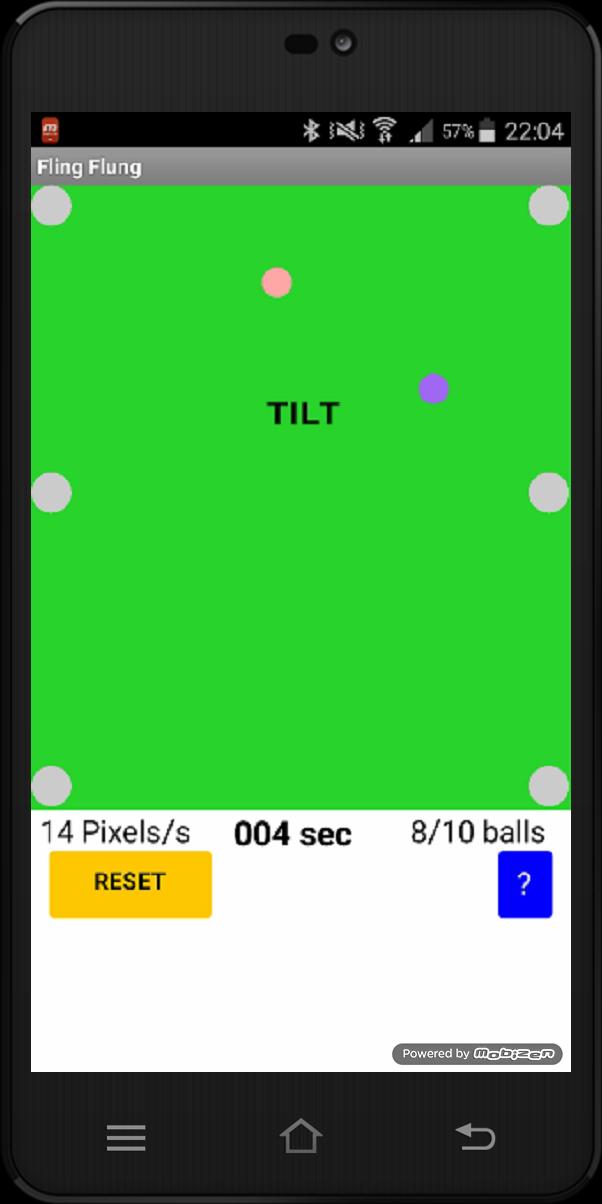 You have a set of 10 balls on a table and you Fling the stick to send the balls into 6 holes. The fling speed and duration of the game are measured. After completing successfully the first round, the player finds a second set of 10 balls but on a longer table.