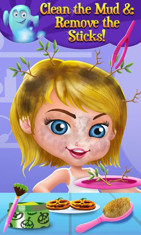 In order to try on a costume, you need to look the part first! Stop by the spa / salon for a Halloween makeover and take all the time you need to pamper yourself and maybe even look a little spooky for the party! Start with a hairbrush and tweezers, and then you can wash and blow dry your hair like a real salon! Don’t forget to brush her teeth with the spooky toothbrushes! In this app, your makeup and beauty tools are even customized for Halloween! Decorate yourself in pumpkin themed face cream, or a bat eye mask, even a spooky makeup remover!