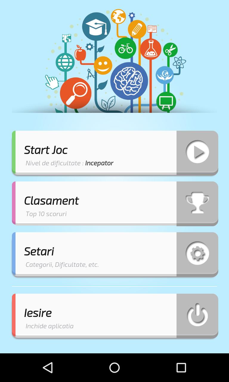 Thousands of questions in the Romanian language from many fields that test your knowledge acquired together, maybe from books maybe from hundreds of television shows like you want to be a millionaire broadcast in Romania that you have followed with such passion and interest.