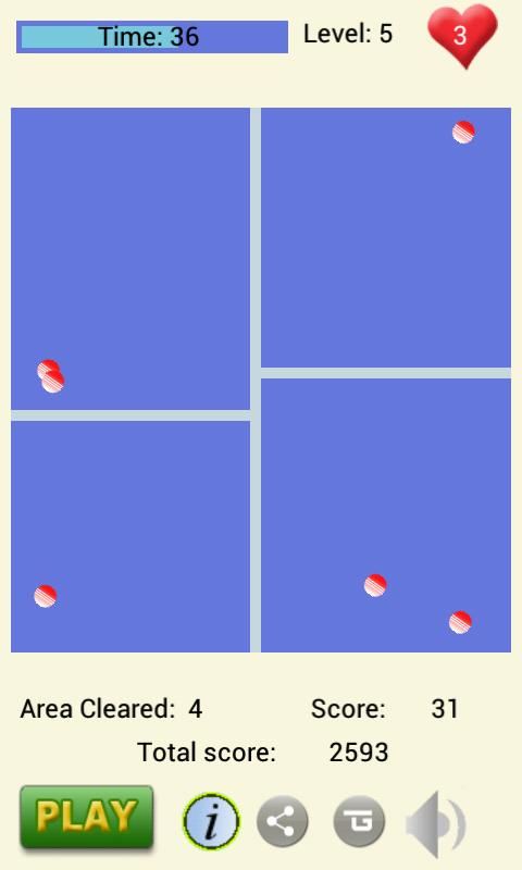 JezzBall is a fun, strategy ball confining multi level game, player's goal is to build the wall to confine the ball in minimum area and clear the rest of the area in given time. If player clears 75 percent area, he wins and crosses the level; in case player fails to clear 75 percent area he has to move to previous level. On win the score points are given, on failure the score points are reduced.