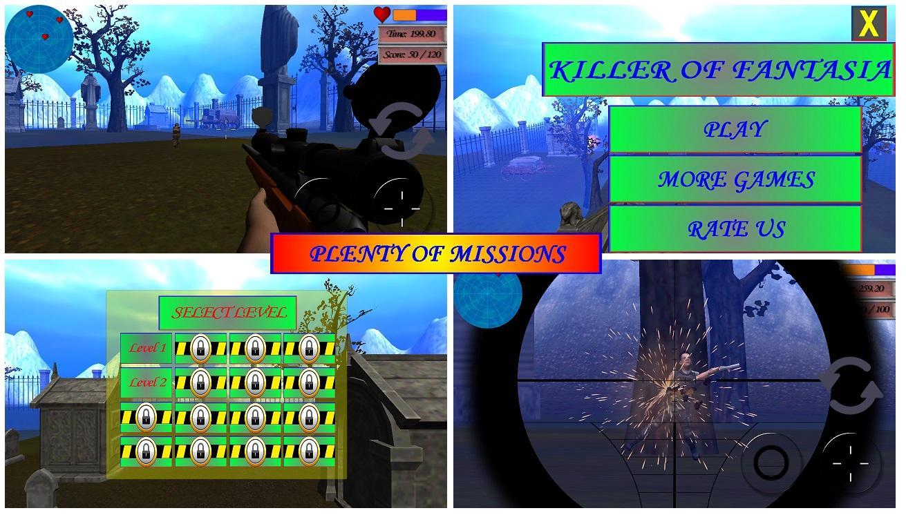 You are a killer in Fantasia which a small country surrounded by mountains. you hunt enemy soldiers and policemen in the game. There are several enemies in every level. You hunt your enemy with your 2 semi-automatic sniper rifles.