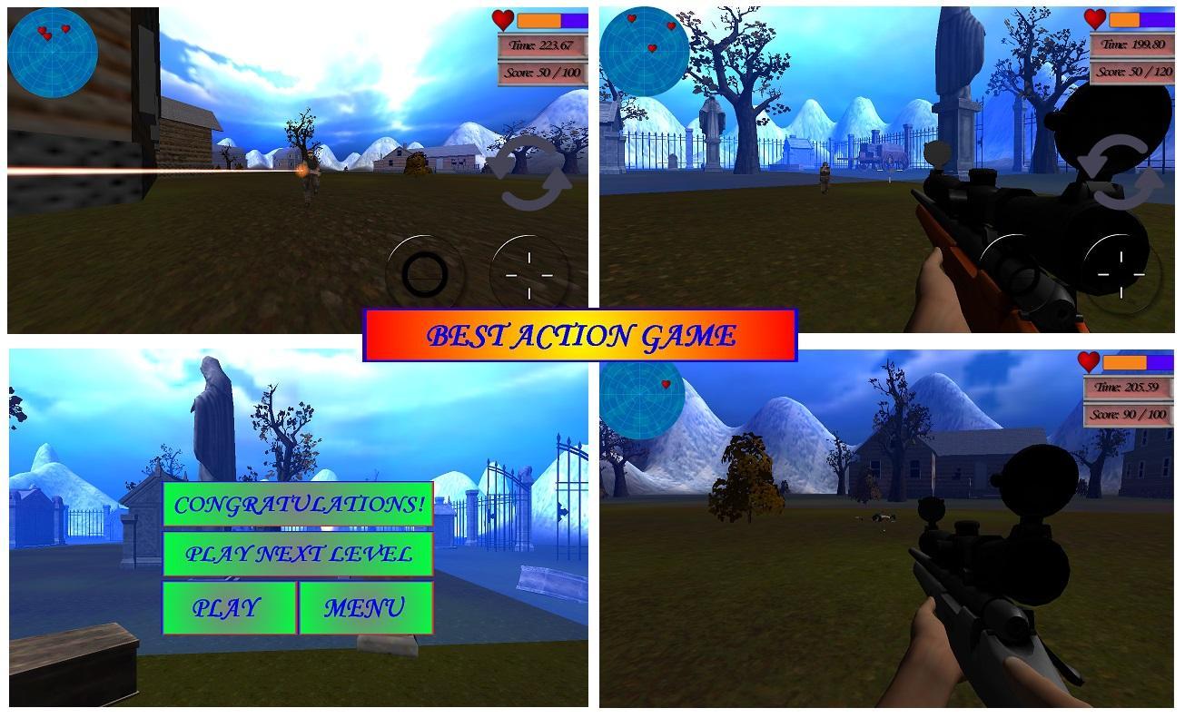 The plot is that you are under counter attack of an elite frontline commando force of counter strike unit sent out to the village and graveyard to fight you at their fantasia. You have to kill defined number of enemy soldiers within given time and you also have to avoid their gunshots in order to survive.