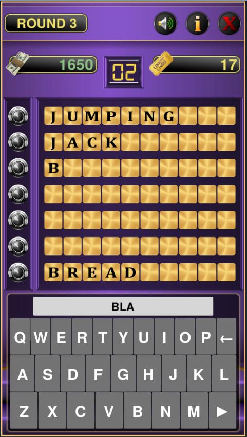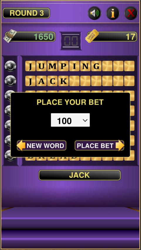 A game consists of three rounds. The first round, twenty-five dollars per unrevealed letter is awarded when a word is guessed. Round two, fifty dollars per unrevealed letter is awarded. Round three is the betting round! The player may bet between zero and one hundred dollars per unrevealed letter. Cash can be lost just as quickly as it is won!