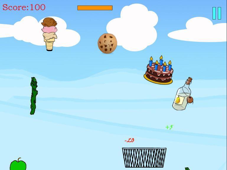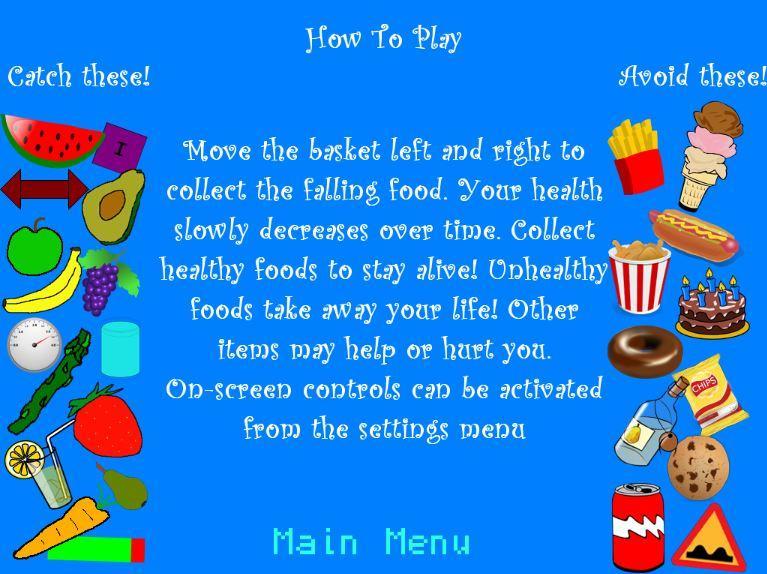 Move the basket left and right to collect the falling food. Your health slowly decreases over time. Collect healthy foods to stay alive! Unhealthy foods take away your life! Other items may help or hurt you. On-screen controls can be activated from the settings menu.