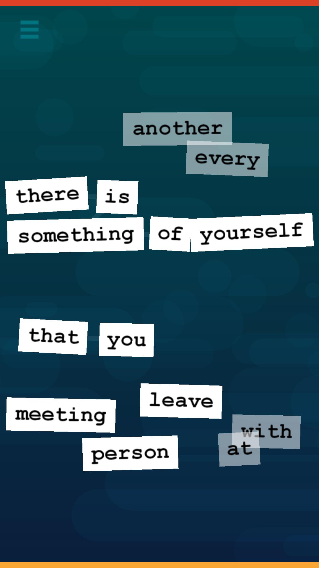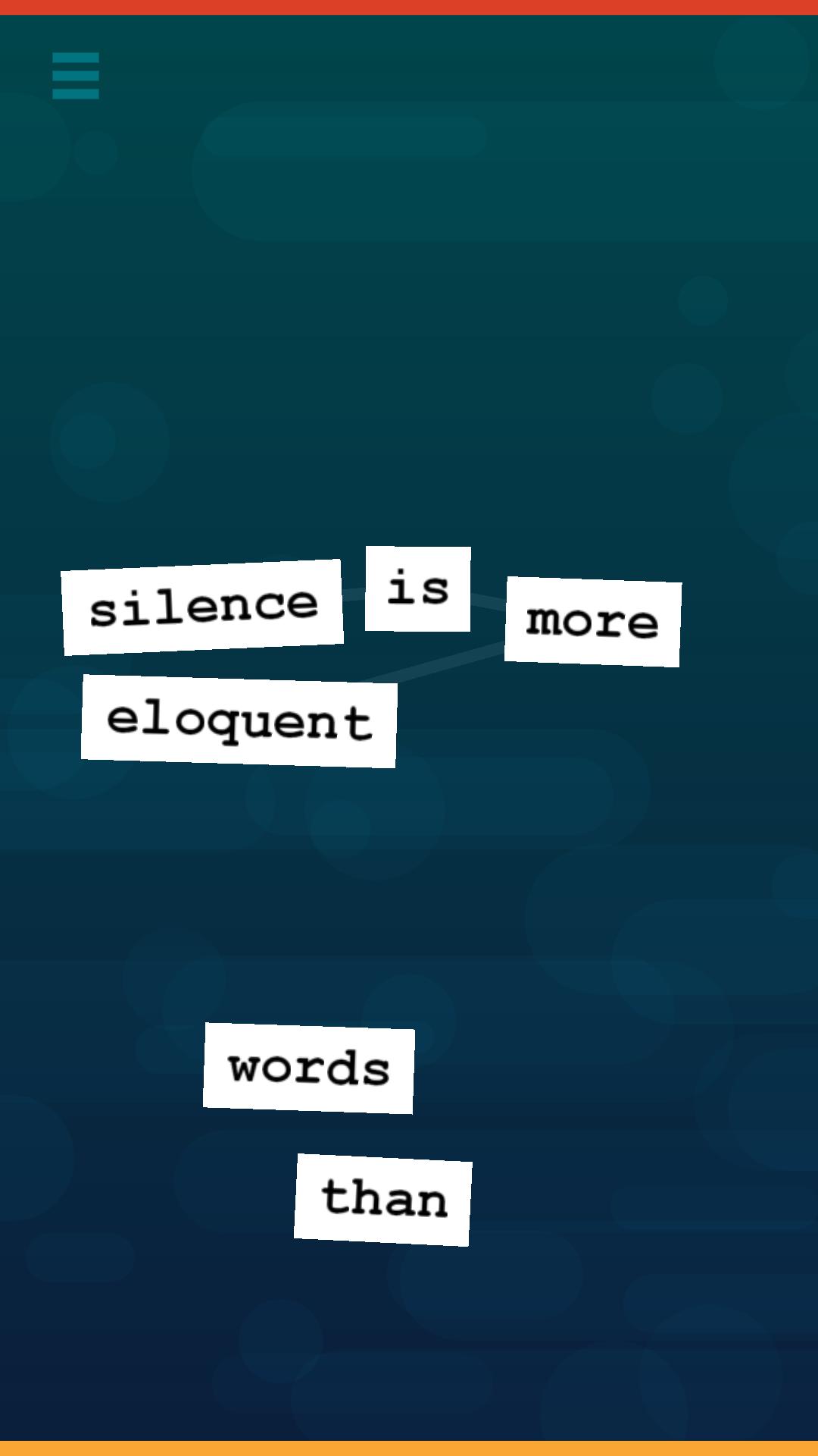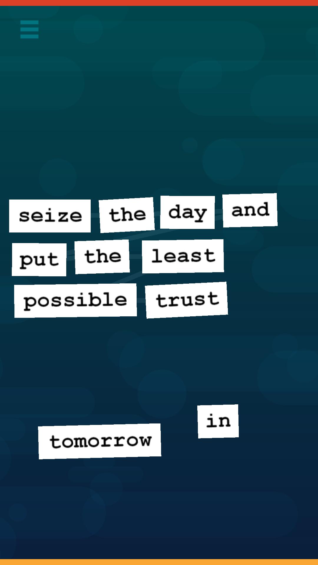 Unscramble the words to uncover inspirational quotes by famous philosophers, leaders, authors, musicians, and more. Quota offers a simple yet unique gameplay concept evocative of the universally popular word magnets.