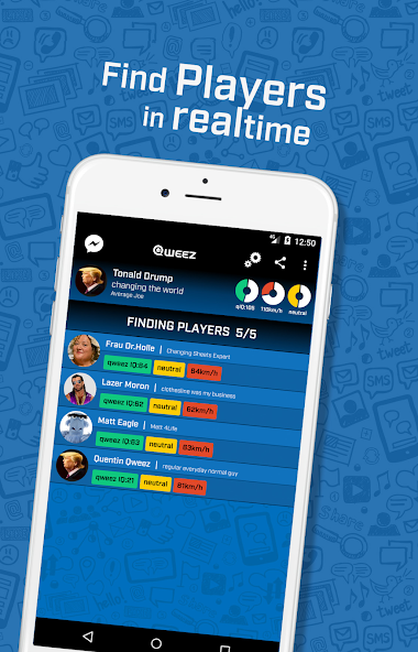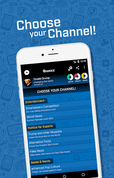 5 persons fight for the most creative, silly, intelligent answer of a question, short description or other statement. The winner will increase his qIQ (qweez IQ), Karma and Speed Stats. Only the Winner of each round can share his output on Facebook. Give your statements to actual news or stuff from the movie, music or gaming industry. All categorized in channels you can choose from.