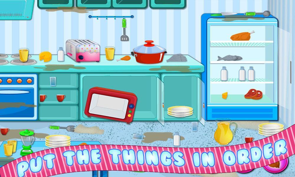 You will be able to use a variety of different tools to clean all the dirt and mess in the kitchen. Everything is out of its place and you have to put them back on their places. You will have to straighten the microwave, put plates back, straighten the glasses etc. After everything is back on its place, you can mop the wet floor; use a sponge to clean any dirt and place all rubbish in the bin. So don’t miss this fun filled game and start right away.