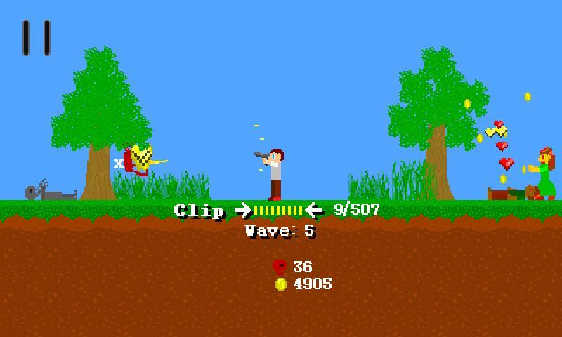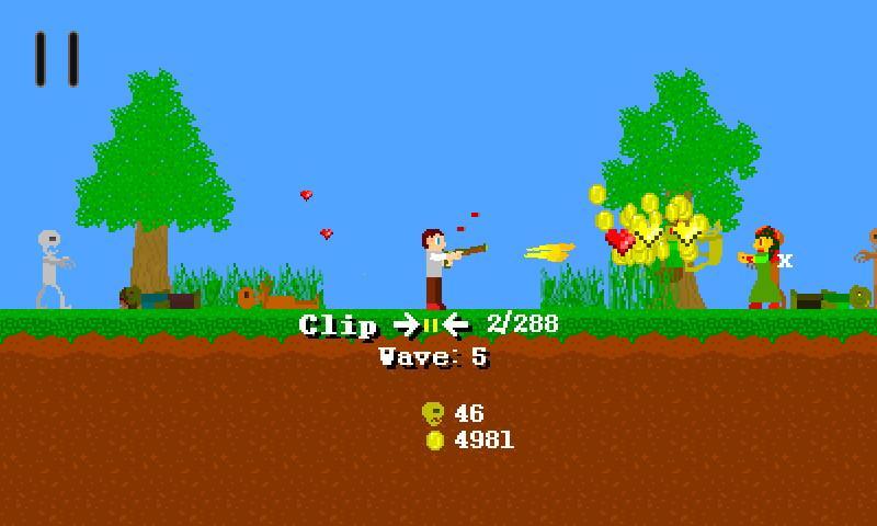 Survive as long as you can against wave after wave of zombies in this retro 8bit styled zombie game! Use simple taps to fire bullets. Tap your character to switch guns. Gain coins by slaying zombies and aliens with a handgun, a revolver, a shotgun, and a machine gun. Head shots do more damage. Spend coins on gun upgrades and new unlock-able guns like the flamethrower!