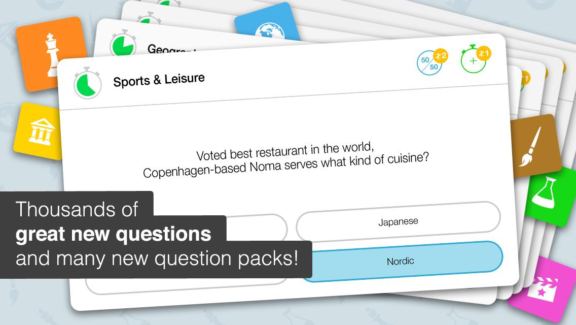 • Personal statistics (in-app purchase). Check out your actual knowledge in the six different categories, and compare your score to your opponents.