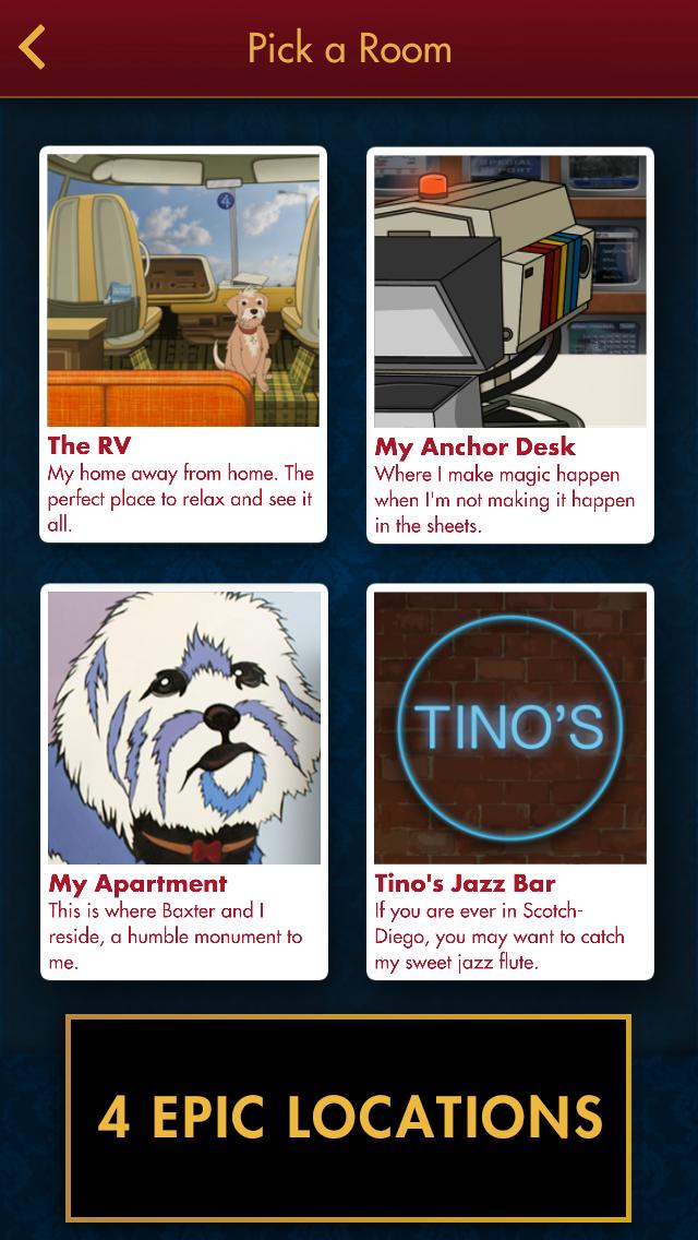 • 4 different locations: Ron's shag-tastic RV, The News Teams' new NYC apartment, the 24 hour newsroom, and Tino’s Jazz Bar