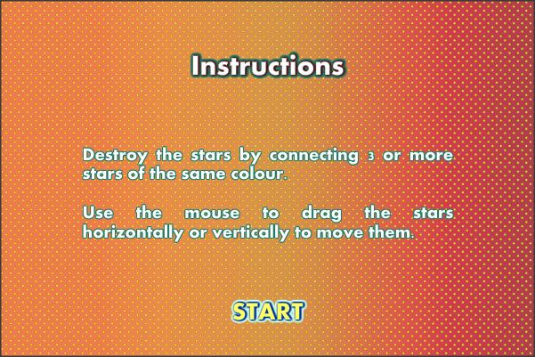 It's in the lyrics, "when you wish upon a star they do come true." Now you can make your dream of catching a star come true in Staries! Your goal in this game is to connect 3 or more stars of the same color so that they can be removed. When the game starts, you will be given a 6x6 grid containing stars of different colors. Click and drag a row or a column of stars so that at least 3 identical stars are connected in horizontally or vertically adjacent positions, and those stars will be destroyed. Continue the process until the star-shaped counter on the left is filled, then you can proceed to the next level. Your score will be displayed above the star-shaped counter. If multiple combos are formed after a single move, stars which carry special powers and extra bonuses may appear, so create more flashy combos to earn the amazing achievements!