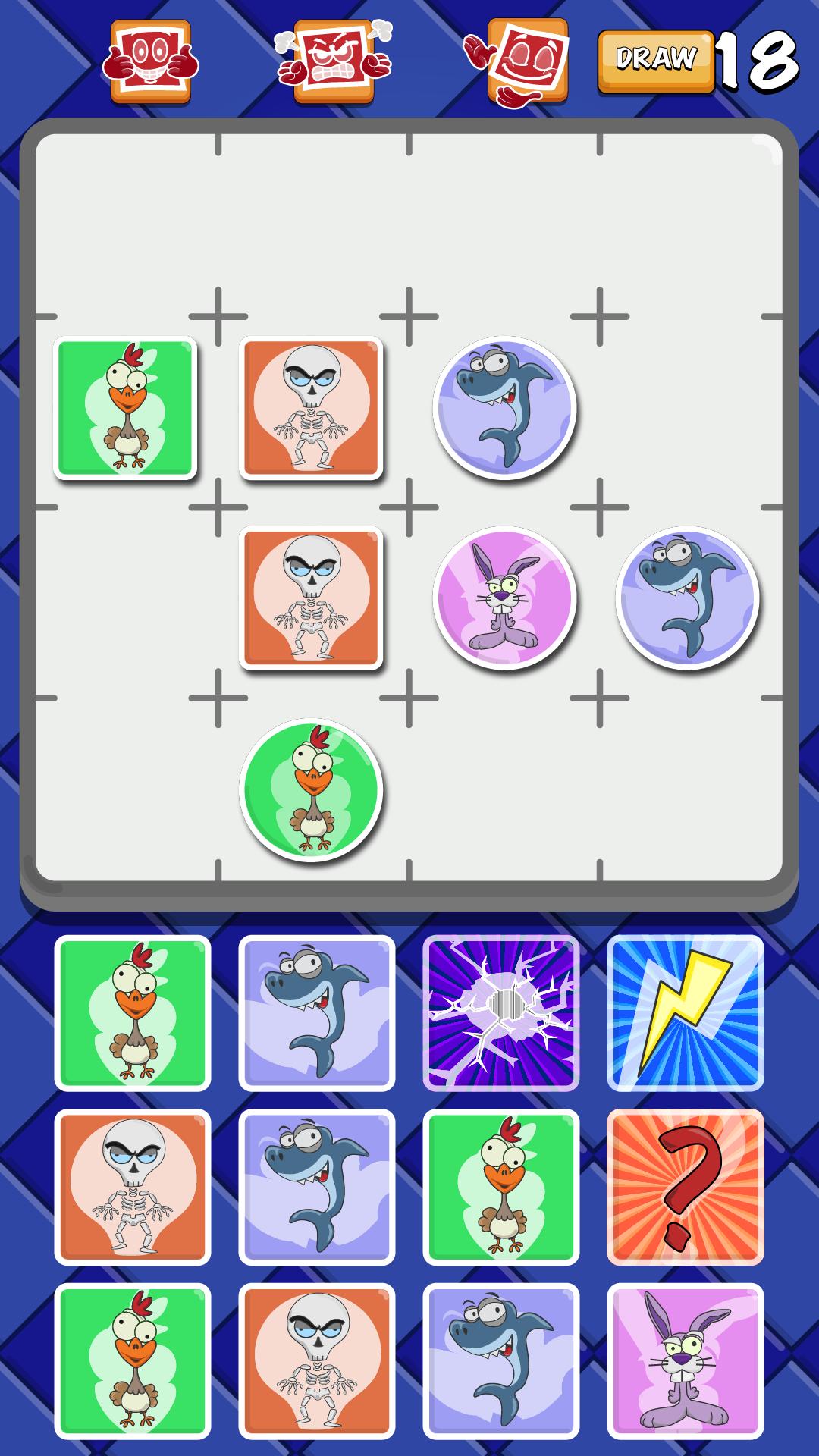 Tusk Battle is a turn based arcade game inspired by first game installed in a personal computer since 1952, tic tac toe. Game consists in a match between two players, the scope of each one is to collect three contiguous equal cards (between 4 seeds: skeletons, sharks, chickens, and rabbits), in a 4x4 grid.