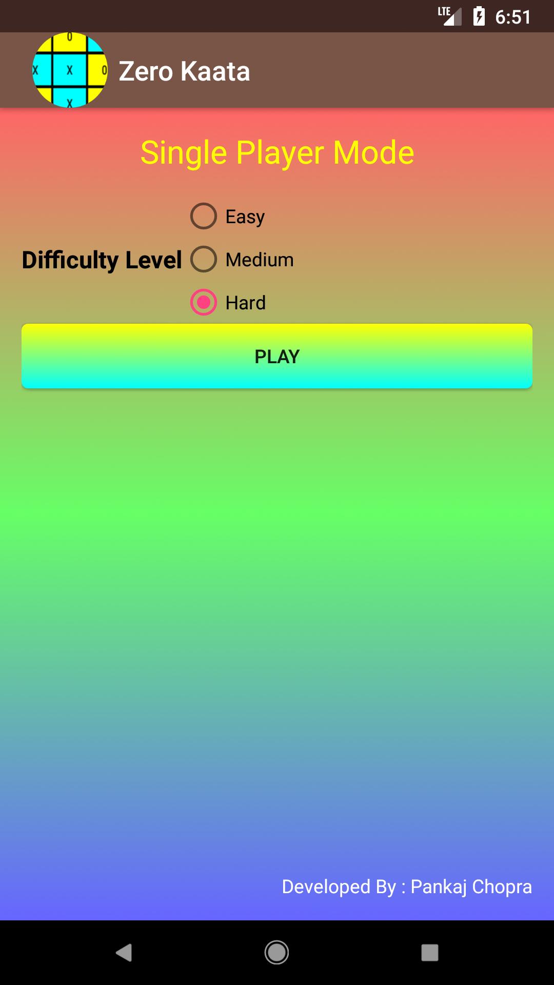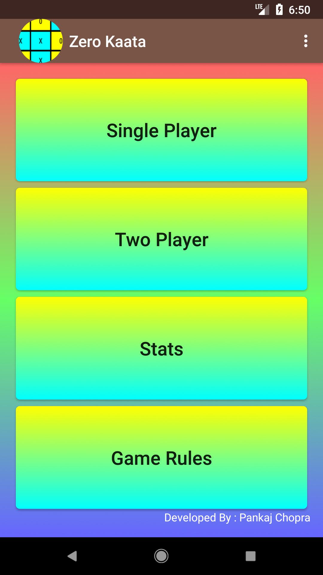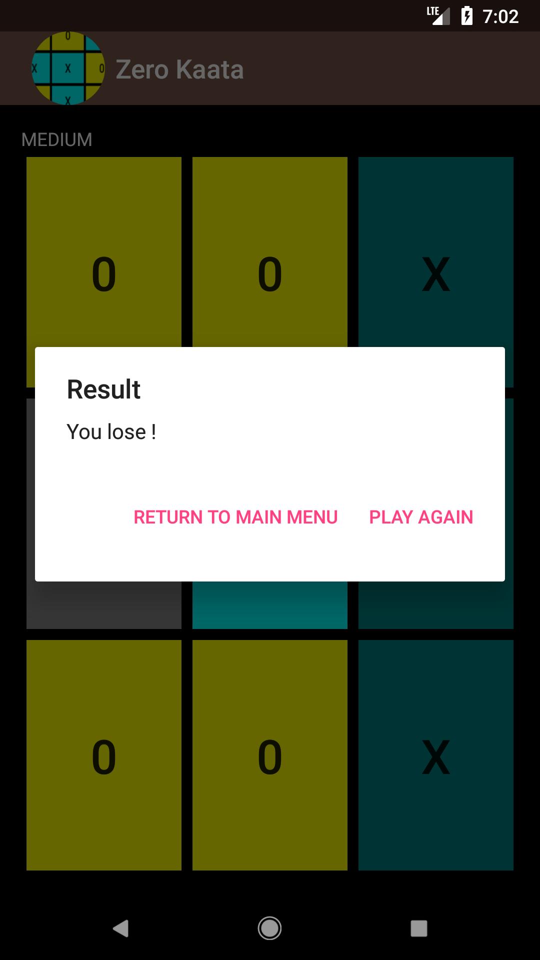 Zero Kaata or Tic-tac-toe (also known as noughts and crosses or Xs and Os) is a paper-and-pencil game for two players, X and O, who take turns marking the spaces in a 3×3 grid. The player who succeeds in placing three of their marks in a horizontal, vertical, or diagonal row wins the game.