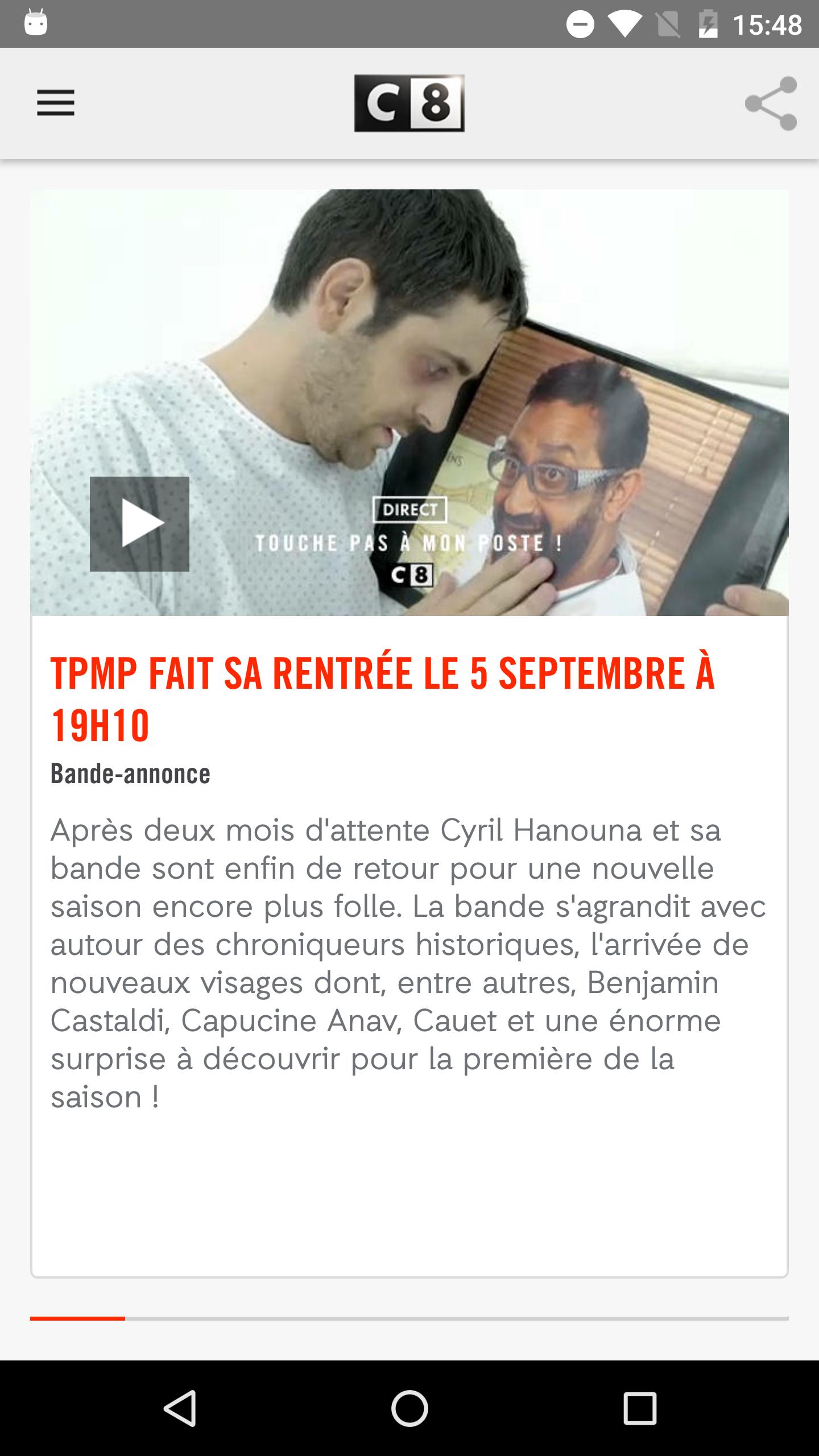 Aplikasi C8 memungkinkan Anda untuk menemukan semua program hiburan secara gratis dan tidak terbatas serta film dan serangkaian C8 : Touche Pas à mon poste, La Nouvelle Edition, Salut Les Terriens, Gym Direct, Palmashow. Temukan mereka secara langsung dan diputar ulang dengan Grid Program TV.