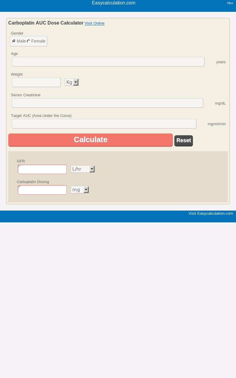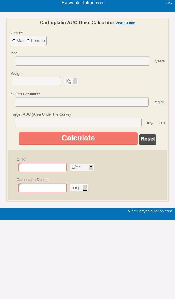 Kalkulator dosis Carboplatin AUC (Calvert) menghitung GFR dalam L/jam, ml/jam atau ml/menit dan dosis kemo karboplatin dalam mg, gm atau mcg.