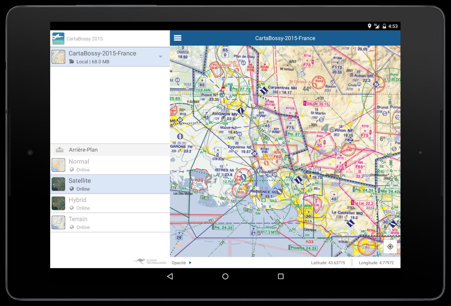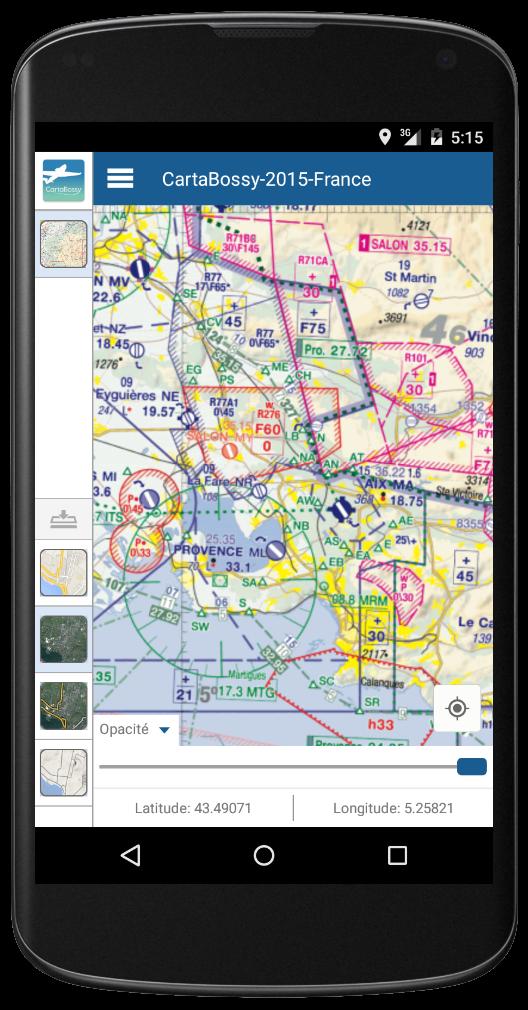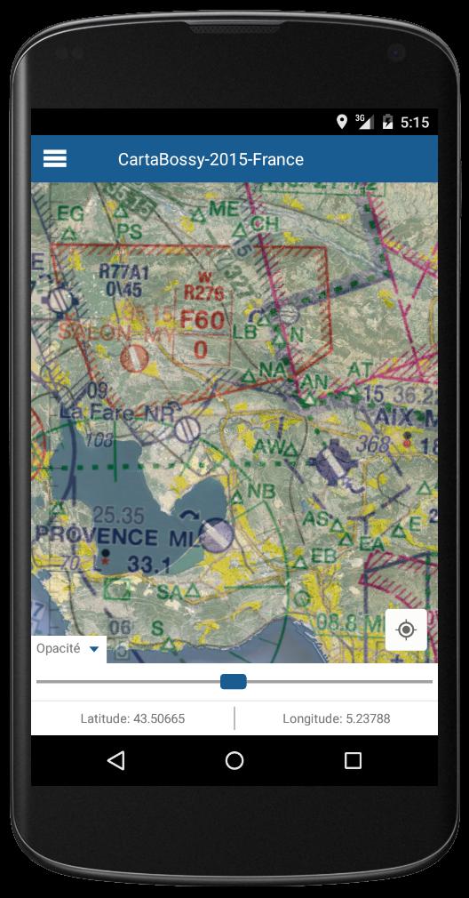 - Aplikasi Prancis Cartabossy 2016 ini bukan aplikasi bersertifikat untuk aeronautika dan tidak boleh digunakan sebagai informasi utama atau dukungan tunggal untuk menyiapkan penerbangan pesawat terbang atau selama penerbangan.