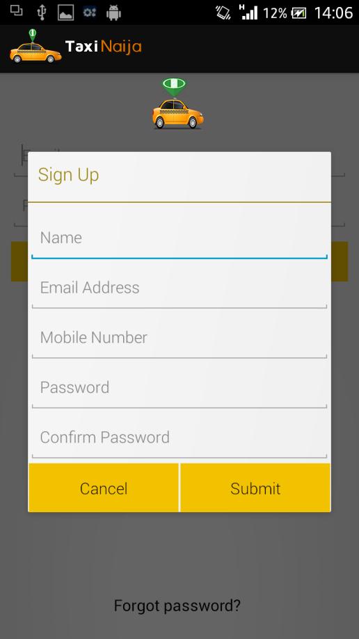 Aplikasi seluler TaxiNaija adalah solusi lengkap untuk menghubungkan pelanggan dengan taksi di Nigeria. Aplikasi ini dikembangkan untuk penumpang dan driver, dengan login terpisah untuk masing -masing. Pengguna dapat meminta tumpangan dari pengemudi terdekat, dan pengemudi dapat membuat mobil mereka tersedia dan menerima permintaan. .