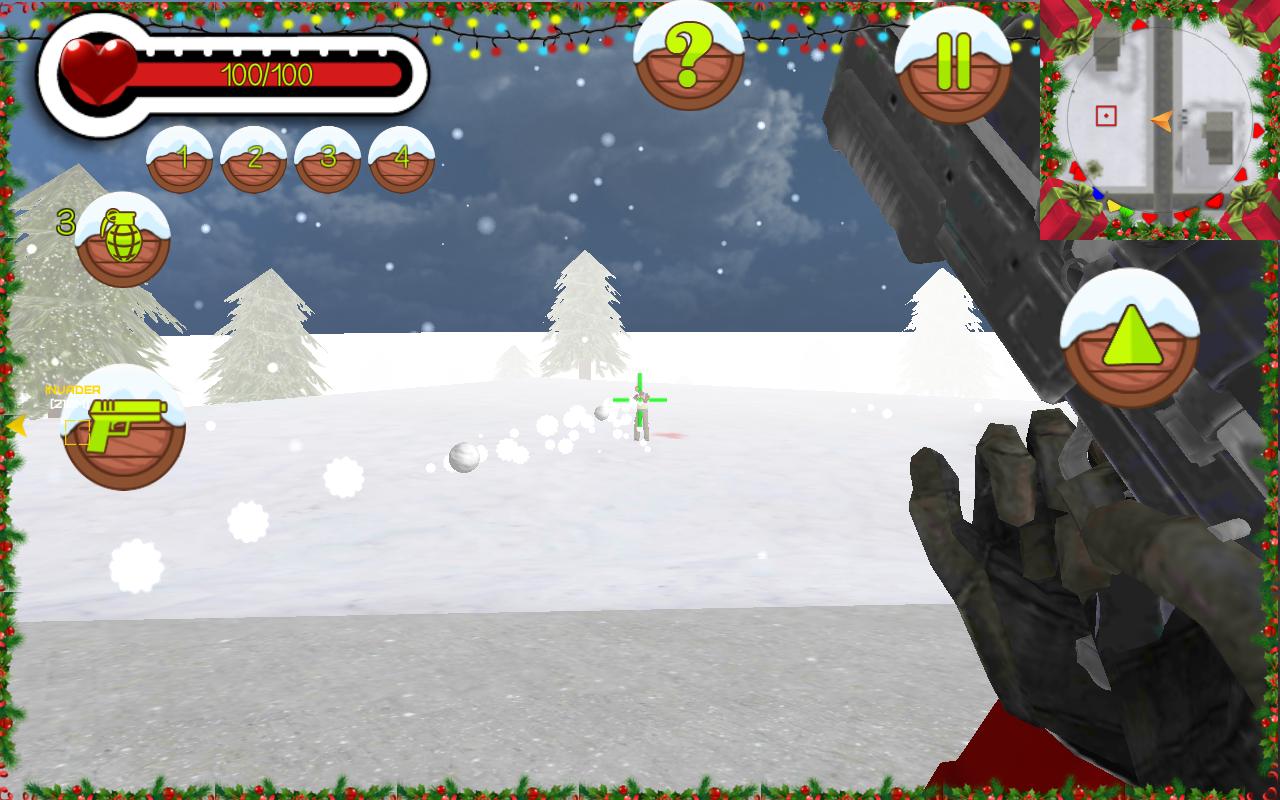Santa Claus - Pahlawan Anda. Kota ditangkap oleh orang jahat. Mereka mencuri hadiah Anda. Tetapi Anda memiliki senjata dan dapat membawa di bawah Coram yang bajingan itu. Snowgun memiliki sedikit harga tetapi kerusakan yang baik. Rogues headshot dan berikan lebih banyak uang. Anda dapat membeli AK-47 atau M16 yang kuat, Sniper Automatic Rifle atau banyak senjata fiksi ilmiah. Siapa bilang, Santa tidak berbahaya apa? Bersihkan kota ini. Simpan Natal!