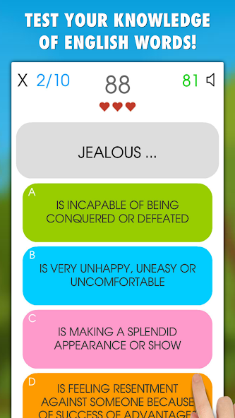 Ada 2 mode game untuk dipilih - "Jelaskan Word" atau "Tetapkan Definisi". Ada 4 opsi, pilih yang benar, hanya satu opsi yang benar! Skor Anda tergantung pada kecepatan Anda. Dapatkan skor terbaik dalam 10 putaran atau 120 detik batas waktu. Hati -hati, Anda dapat membuat kesalahan Max 3 jika tidak permainan Anda berakhir.