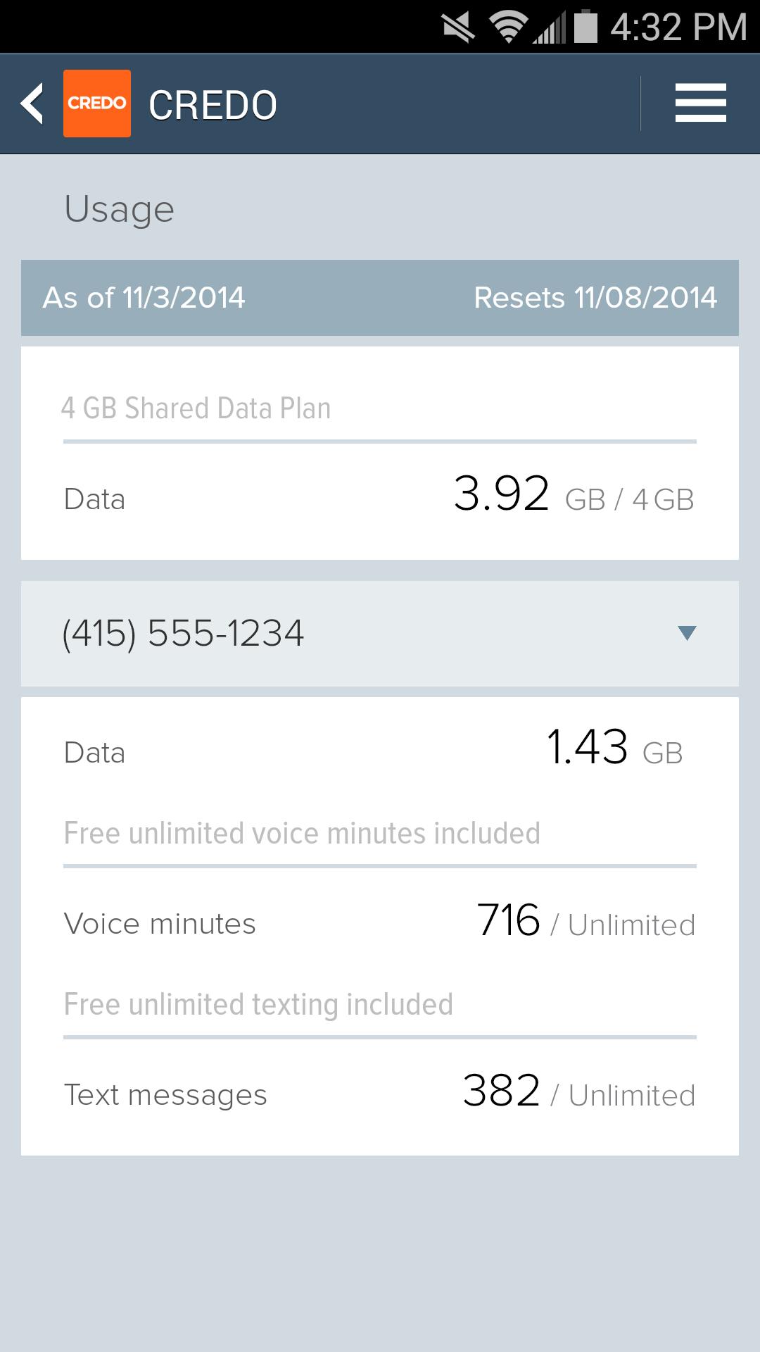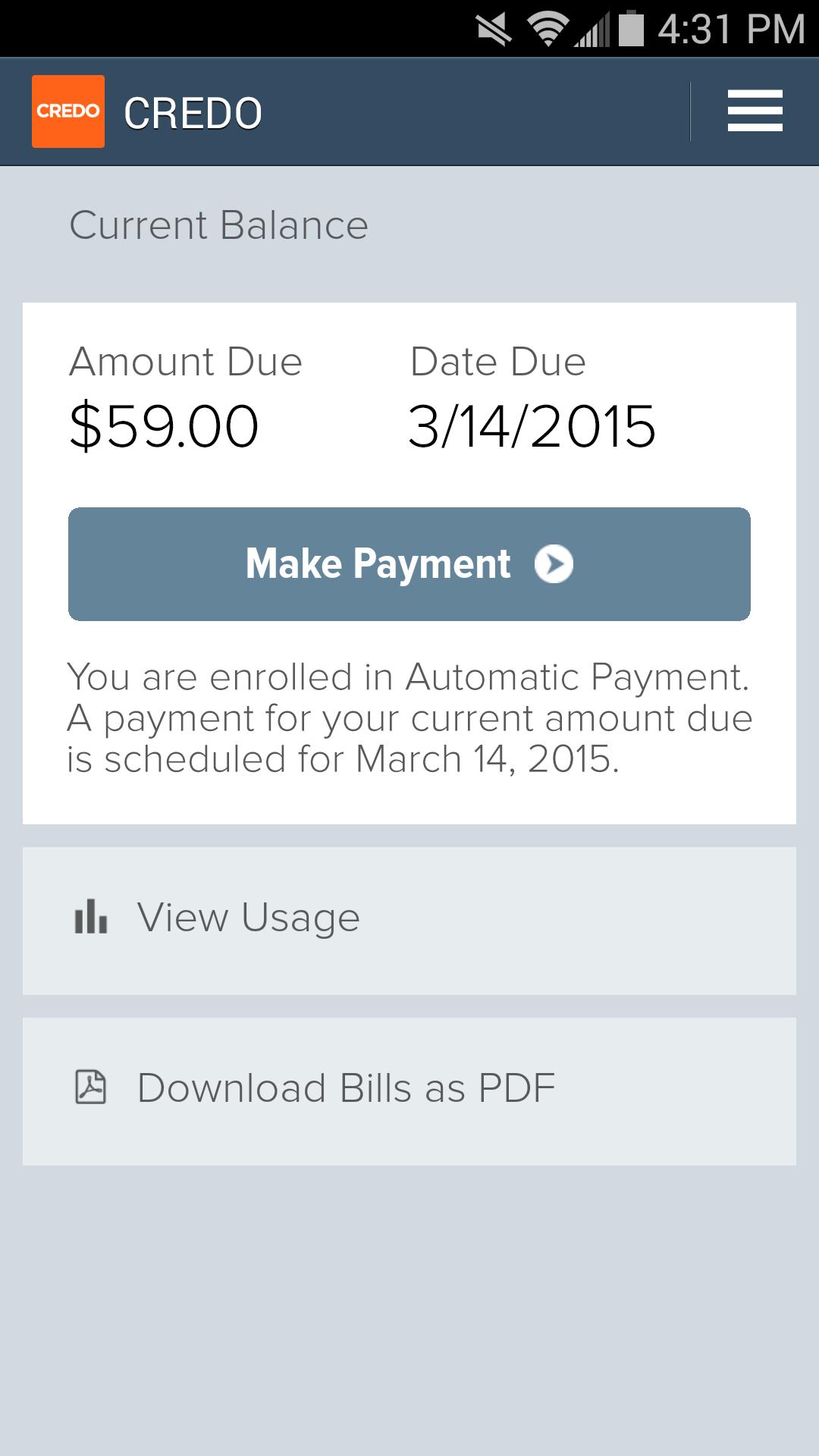 請求書をすばやく支払い、 CREDO Mobileの毎月の使用を表示します。