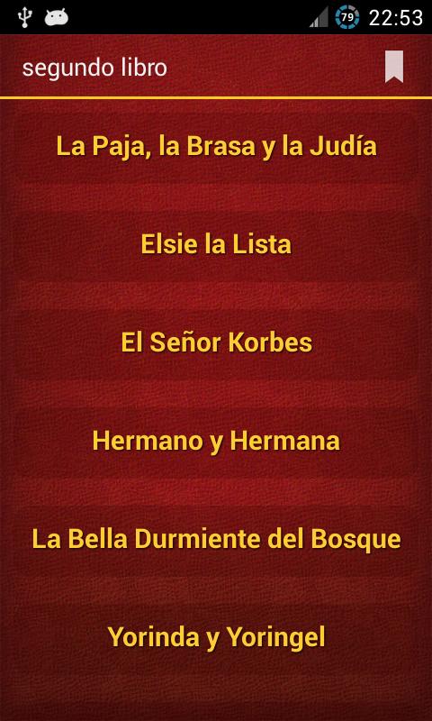 Second volume: the straw, the grilled and the Jewish, Elsie the list, Mr. Korbes, brother and sister, the Sleeping Beauty of the Forest, Yorinda and Yoringel, Allerleirauh, the wise pastor, the two walkers, Dr. Saberodo, the hedgehog and the husband of the hare, the gob Devil, bear skin, the queen bee, the enigma, the scourge of the sky, the cat with boots, theマントル、