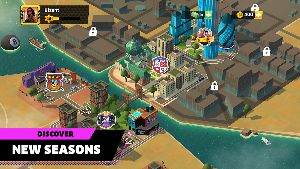 역동적 인 도시 환경에서 설정된 계절적 도전에 참여하십시오. 이 도시는 지역이나 수영장 클럽으로 나뉘어 각 클럽의 챔피언이되어 다음 단계로 진행됩니다. 당신의 궁극적 인 목표는 그랜드 마스터가되기 위해 도시의 보스에게 도전하고 물리 치는 것입니다. 이 8 볼 풀 게임에서 지배 할 수 있습니까?