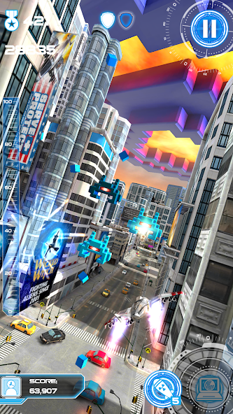 빨리 날고 적을 폭파하고 하늘 스크레이퍼를 지나서 침략에 맞서 싸우고 도시를 방어하십시오.