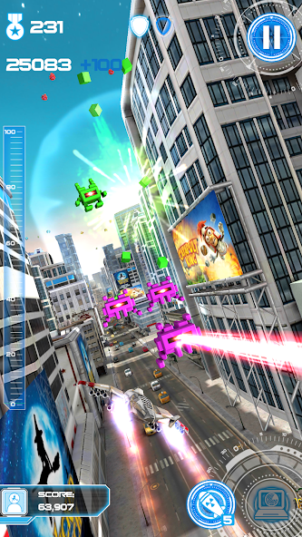 좁은 골목길을 통과하고, 폭발하는 건물을 통해 불을 피우고, 키가 큰 하늘 스크레이퍼 위로 올라가는데, 어머니 선이 새로운 적의 파도를 내리기 위해 기술과 반사에 도전합니다. 도시 거리를 날아 가면서 침략자를 탭하고 백만 픽셀로 폭발하는 것을 지켜보십시오!