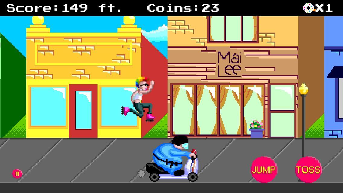 당신이 경찰에서 달리기 때문에 바퀴를 묶고 도넛을 잡으십시오! 도넛과 동전을 수집 할 때 용, 공룡, UFO를 지나서 지나가십시오! 악어, 좀비 손, 라디오 전단지, 거리 피자 등과 같은 야생 장애물을 피하십시오. 보도에서 불법적으로 스케이트를 타기 위해 도넛을 던지거나 꼬리 위의 경찰을 뛰어 넘습니다. Bodacious 파워 업을 위해“Strange Donuts”를 잡아 Po-Po보다 병든 이점을 얻으십시오. 수집 한 코인을 사용하여 특수 스타터 도넛으로 Tubular New 캐릭터를 잠금 해제하거나 화면 오버 화면에서 롤을 켜서 높은 점수를 높이는 데 도움이됩니다. Cowabunga!