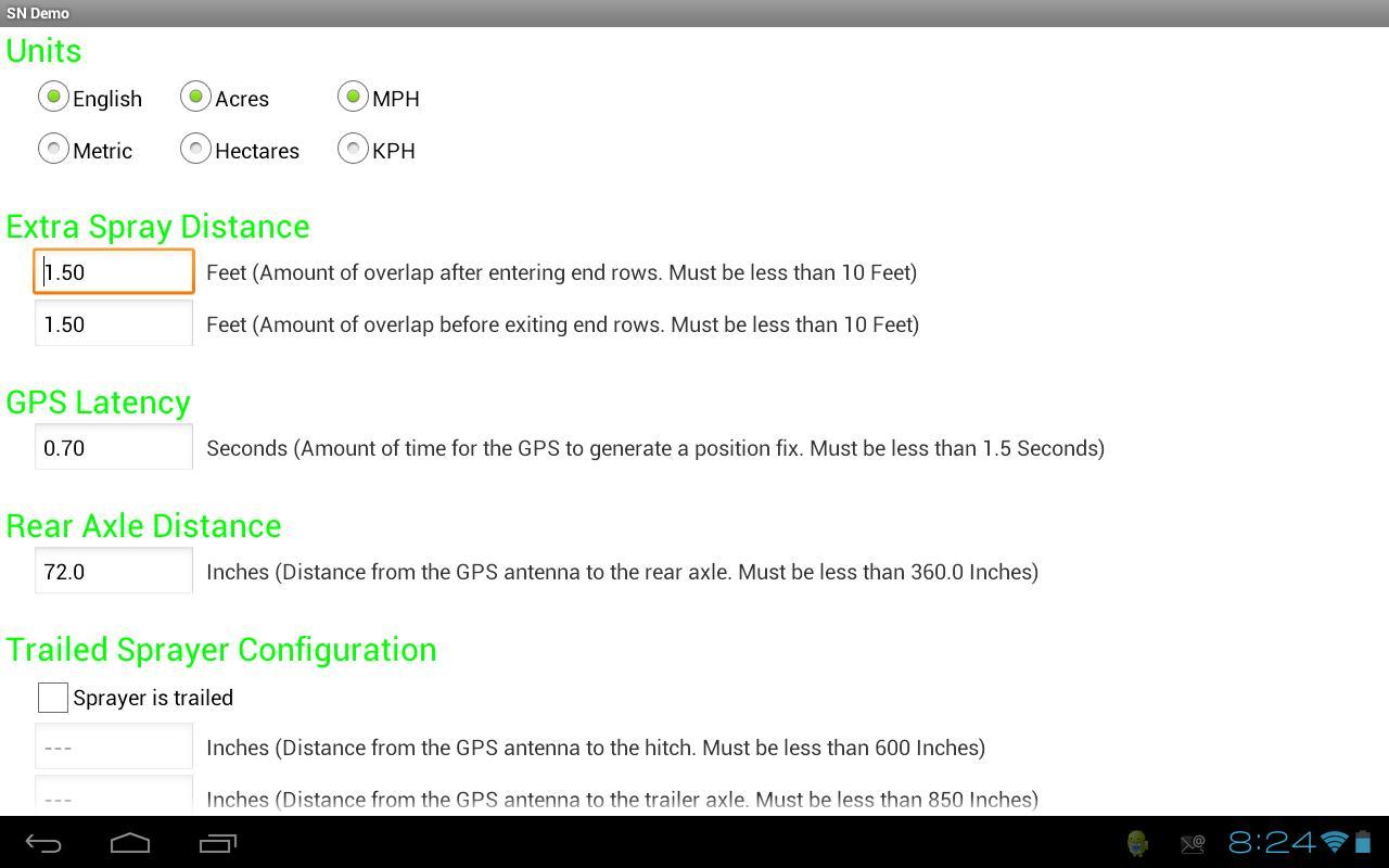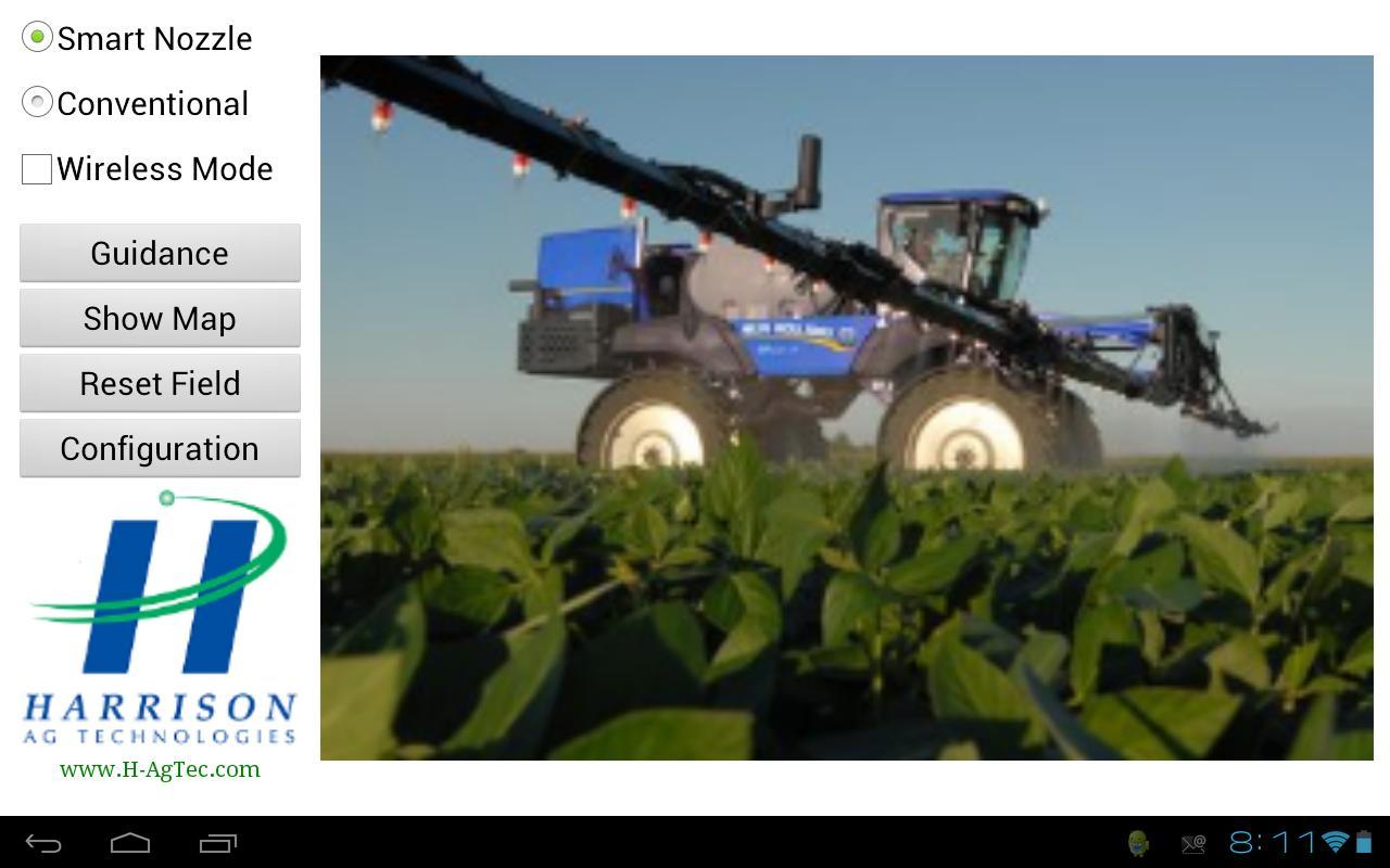 A Harrison AG lançou recentemente o software para o sistema operacional Android e publicou este aplicativo de demonstração da versão beta para avaliação e comentário de nossos usuários e distribuidores. É quase uma versão completa do software de produção, mas possui capacidade de configuração limitada e as comunicações USB estão desativadas. Para tornar as avaliações possíveis sem a necessidade de operar um pulverizador, um simulador de veículo é incorporado ao software de demonstração. Depois que o mapa de navegação é exibido (pressionando "Mostrar mapa" na tela de inicialização), a velocidade do simulador de veículo pode ser ajustada simplesmente deslizando a borda direita da tela de toque. Da mesma forma, o cabeçalho do simulador é direcionado deslizando a borda superior da tela.