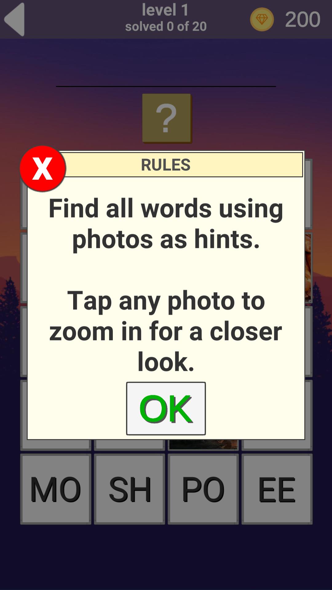 Adivinhe a palavra oculta usando a foto para a pista, as palavras são divididas em fragmentos, os enigmas são de complexidade diferente, de palavras fáceis, que levam segundos para resolver palavras complexas, que levarão muito tempo para resolver.