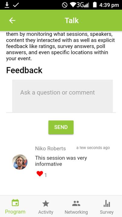 Взаимодействуйте с другими участниками, докладчиками и сотрудниками мероприятия. Смотрите повестку дня, ответьте на вопросы и дайте организаторам обратную связь.