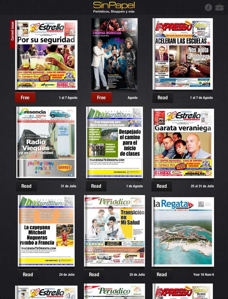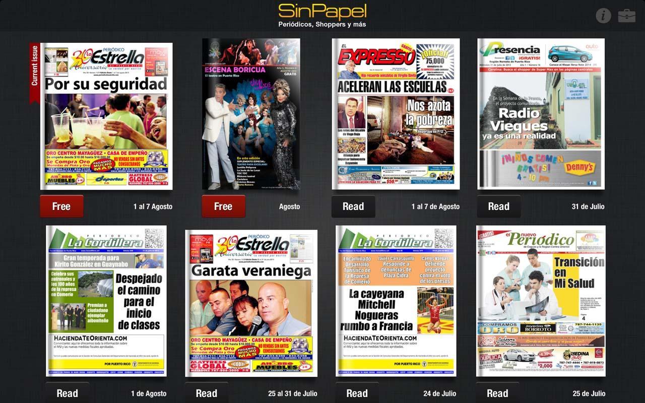 Sin Papel это ваша позиция или киоск, в котором простым и удобным способом, который вы получаете, загружаете и читаете газеты, журналы, каталоги и многое другое. С Sin Papel вы можете испытать публикации с динамическими компонентами в соответствии с каждой публикацией: видео, фотогалереи, аудио, ссылки на страницы и документы.