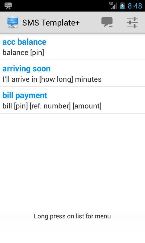 SMS -шаблон+ - это приложение, которое позволяет создавать и управлять шаблонами SMS -сообщений. Вы можете хранить широко используемые сообщения с возможностью добавлять параметры в сообщения.