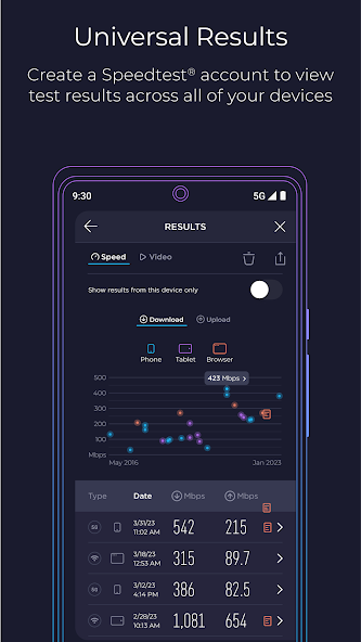 - Следите за своей историей Speedtest и посмотрите подробный разбивку каждого результата.