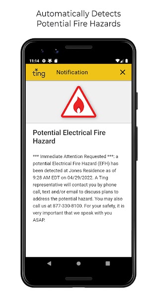 Если обнаружена опасность для электрического пожара, команда пожарной безопасности Ting свяжет вас и направит вас через определение и смягчение опасности. Некоторые идентифицированные на Ting опасности связаны с неудачными или неисправными устройствами или приборами, которые просто необходимо удалить из обслуживания / замены. Другие связаны с опасной энергией, поставленной в дом местным поставщиком услуг электроэнергии. Тем не менее, другие опасности развиваются при проводке, соединениях или другой электрической инфраструктуре по всему дому; Когда этот тип опасности подозревается, команда пожарной безопасности Ting - с вашим одобрением - координирует лицензированного электрика, чтобы посетить ваш дом, чтобы изолировать и исправить опасность. Ting включает в себя пожизненный кредит до 1000 долларов США для покрытия затрат на рабочую силу такого ремонта - подробности см. Условия обслуживания Тинга.