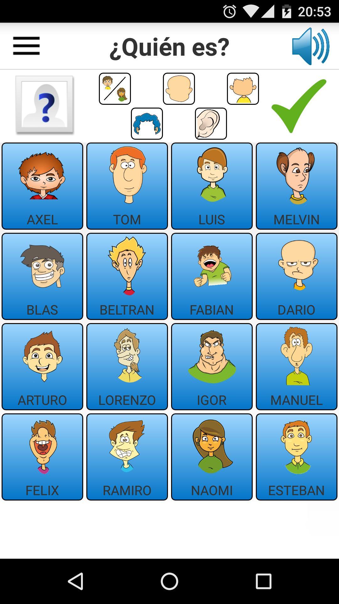 Вопросы, которые можно задать, доступны из 5 значков, расположенных в верхней части экрана, слева от зеленого чека. Каждый значок откроет всплывающее окно с различными вопросами, которые мы можем задать. Вопросы сгруппированы в 5 категорий, и на каждой иконе изображены вопросы в этой категории (общее, лицо, одежда, волосы, уши).